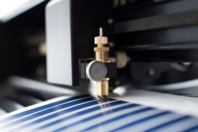Première étape : préparer votre logo pour le flocage. Nous découpons, avec une machine de grande précision, votre motif dans un matériau généralement vinyle, puis nous l’échenillons à l’aide d’une pince. Le motif ainsi découpé est méticuleusement positionné sur le vêtement.
